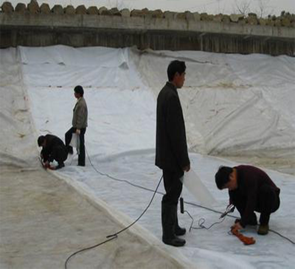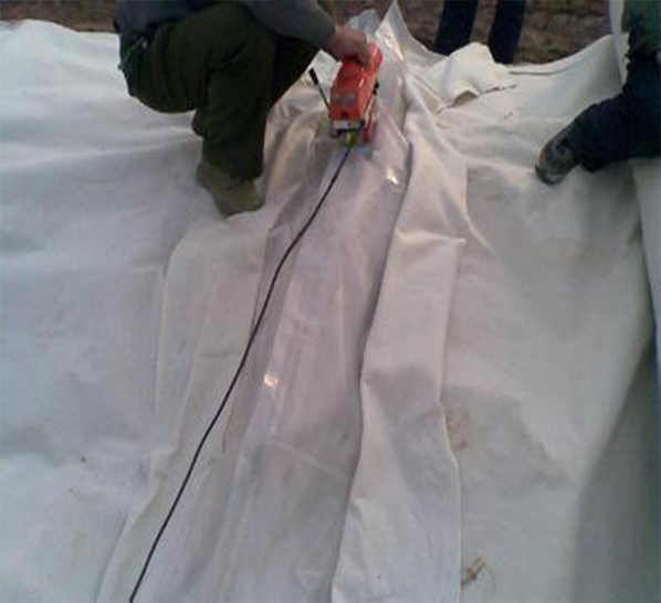 4、鋪設(shè)時(shí)土工膜不要拉得太緊,兩端埋入土體部分成波紋狀較好,特別是與剛性材料錨固時(shí),應(yīng)留有一定的伸縮量。